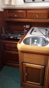 oddělené WC, lihový vařič -2 plotny v závěsu, dřez s tekoucí vodou, venkovní sprcha, kompresorová lednice, zásuvka USB, stolek v kokpitu, badenplato